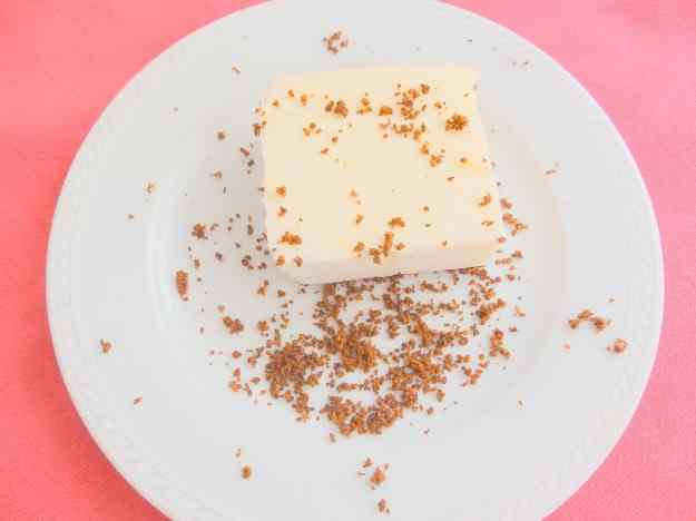 - A la zona central hi posem llardons esmicolats, una mica de canyella, sucre i ho ruixem amb gotetes d’anís (per exemple, Anís del Mono). Es plega una part de la massa per sobre i es torna a repetir l’operació. Finalment es plega la tercera sobre les dues anteriors i es tanca minuciosament amb una forquilla, segellant els quatre cantons.