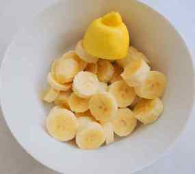 - Es barreja el sucre amb la mantega fosa fins fer una pasta lligada. S’afegeixen els rovells d’ou i la farina amb el llevat i el pessic de sal. Queda una pasta força espessa a la qual afegim els plàtans a trossos. Tot plegat es passa pel minipimer. Un cop la pasta esta ben triturada i sense grumolls, s’incorporen les clares que haurem muntat a punt de neu de manera que la massa quedi flonja.
