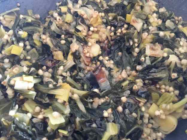 2. Incorporem les bledes, tallades petites, el blat, el xarop i el brou. Salpebrem, tapem i deixem coure fins que el blat estigui cuit (les bledes ja ho estaran segur). Jo crec que amb quinze minuts n´hi ha prou, és qüestió que ho comproveu una mica abans d´apagar el foc.