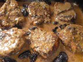 En una olla a pressió poseu un raig d’oli i marqueu les cuixes, retireu i reserveu, afegiu en la mateixa olla totes les verdures tallades a trossets, saleu i sofregiu, quant estiguin sofregides afegiu el tomàquet i seguiu sofregint, seguidament poseu una cullerada de polpa de nyora, remeneu i afegiu el vi, deixeu evaporar. Introduïu les cuixes i afegiu aigua fins a quasi cobri-les, salpebreu, tanqueu l’olla, i a partir de quant surti el vapor deixeu coure trenta minuts, un cop oberta l’olla, trèieu les cuixes i tritureu la salsa, poseu la salsa en una cassola i poseu les cuixes dins, per altre banda en una paella amb mantega i una mica d’oli sofregiu les prunes (les prunes teniu-les una estona en aigua perquè s’estovin), emplateu les cuixes amb la salsa i les prunes.