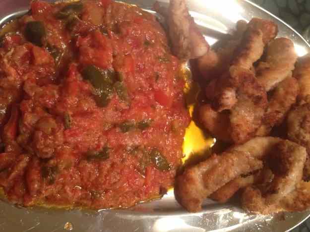 - En una cassola i amb tres cullerades d’oli, fregiu les anelles de calamar retireu-les i en el mateix oli, si cal n’afegiu, fregiu lleugerament, primer les cues de gamba pelades, (reserveu-ne una per cada plat, sense pelar) i desprès els rap tallat a daus reserveu fora de l’escalfor.