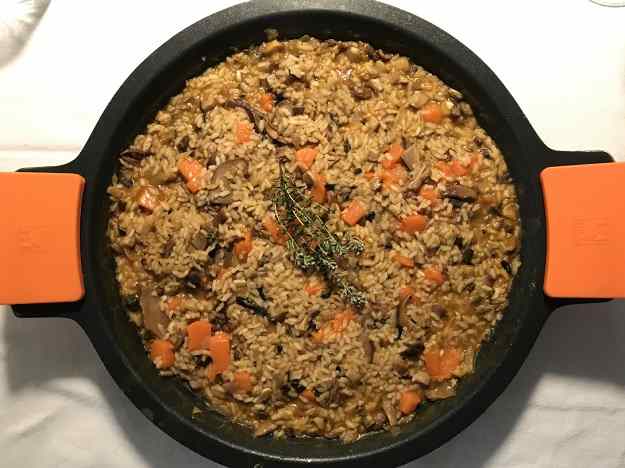 10. Quan estigui tot unit i l’arròs una mica perlat, afegim el brou de verdures i les fulles de farigola. Pugem el foc a 8 perquè arrenqui a bullir, i programem uns 10 mins.