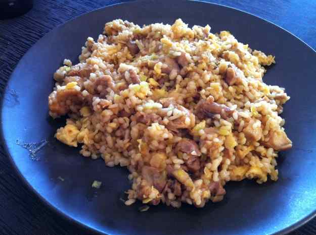 Podem fer els ous, que han de ser remenats, al mateix wok on saltejarem el pollastre amb el porro (tal i com van fer a classe) o fer-los apart i a darrera hora incorporar-los al wok (com vaig fer jo). Quan tinguem el porro i el pollastre cuits i afegim l´arròs, donem unes quantes voltes i finalment afegim una mica de salsa de soja i el pols de dashinomoto (semblant al dashi en pols) disolt en aigua (jo aquest darrer pas no el vaig fer…però sense cap raó aparent…next time ho faré!).