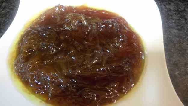 Obviament, començarem preparant la salsa. Primer sofregirem la ceba en una paella o una cassola gran. Una vegada daurada hi afegirem l´all, el gingebre i la citronela i ho seguirem daurant una estoneta més.Quan estigui tot ben potxat i daurat hi tirem el sucre, la mel i la “melaza” deixant caramelitzar durant 3 minuts. Jo no tenia “melaza” (confesso que no sé què és) i vaig posar un total de 200 gr de mel. Després incorporem el suc de taronja i el vinagre i seguim coent-ho fins que bulli. Moment llavors d´afegir-hi la mostassa, la salsa worcester (perrins) i el ketchup. Remenem i hi tirem el tomàquet triturat, deixant-ho coure trenta minuts més.