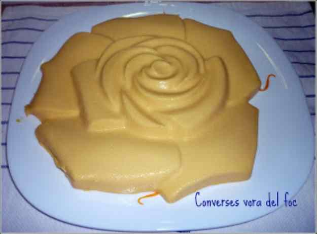 - Abocar-ho tot sobre un motlle humitejat amb aigua (jo he fet servir un de silicona). Deixar que es refredi una mica abans de ficar-ho dins la nevera. Passades unes hores és pot desemmotllar i servir amb una mica de xarop de xocolata.